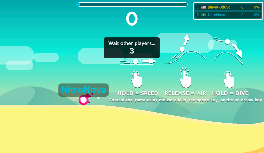 You begin on a rolling sandy slope. Hold down to accelerate while you build speed with gravity and slope helping you. The longer you proceed to build momentum, the higher your jump potential will be.